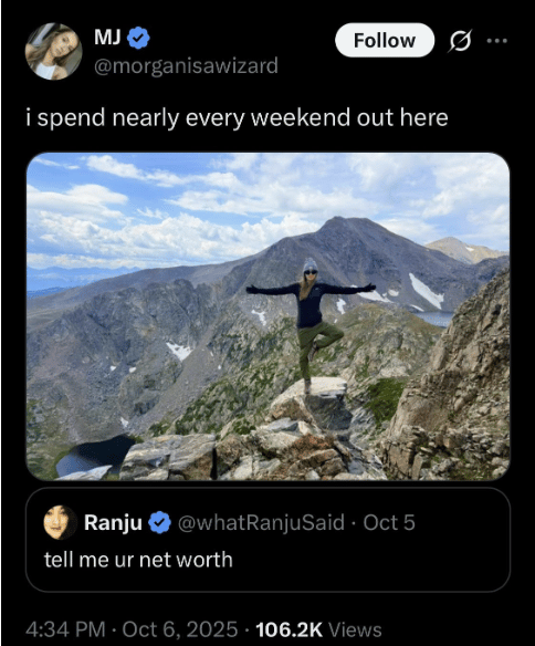 MJ’s tweet captures this same idea through a simple image of her on a mountain. Freedom begins when you can spend your weekends there. The next step is having the choice to go during the week or at any time you want.