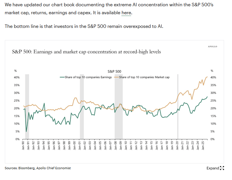 It shows the S&P 500, the index we’ve all been told is the gold standard for "diversification", reaching a level of concentration we haven't seen in modern history. Nearly 40% of the entire index is now just ten companies. If you own the S&P 500 today, you aren't betting on the American economy; you’re betting on a tiny, elite club of AI-adjacent tech giants.