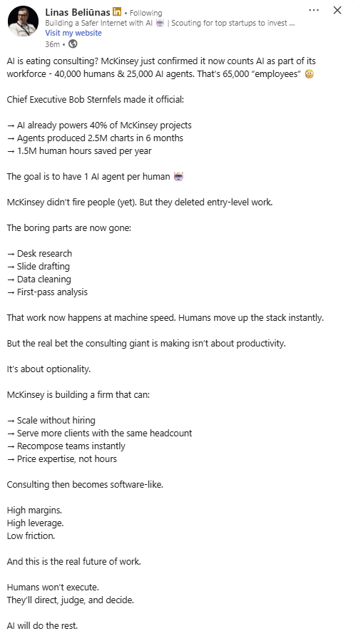 Fascinating Perspective by McKinsey CEO. This seems to be the future of white-collar work that affects most or all of us reading this.