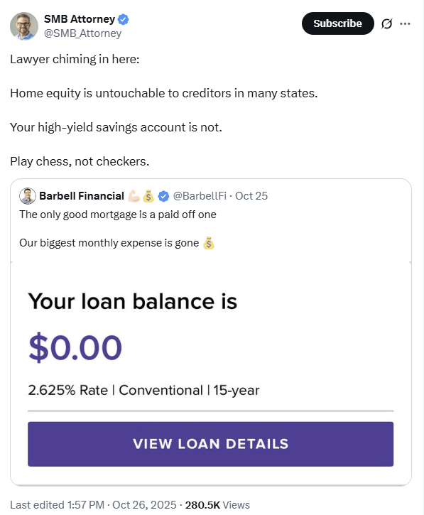 This Tweet by Barbell Financial went viral over the weekend, around paying off a low-interest-rate mortgage. My two cents, this goes way beyond what the numbers recommend.