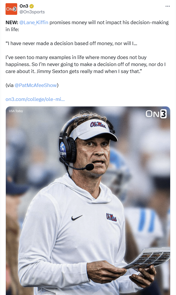 Food for Thought. The whole college sports landscape is fascinating to watch from a financial and business perspective. The Lane Kiffin story is one of the more interesting storylines. I found his quote on money decisions interesting. One could argue that is easy to say when you're already making $9 million annually and potentially going to $13 million plus.