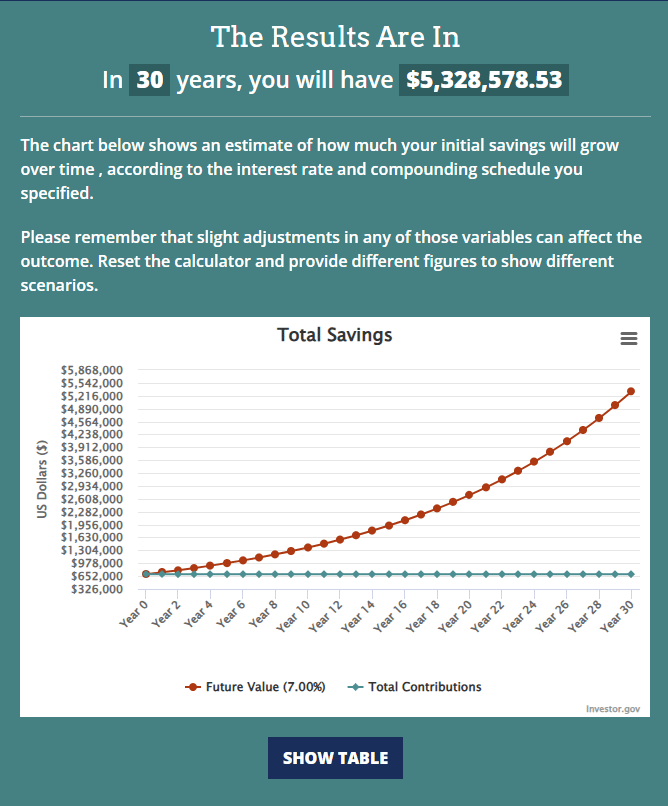 I wanted to see what it looked like, assuming a 7% return over 30 years. Assuming she invested $700k, keeping $300k for spending now. Here are the results.